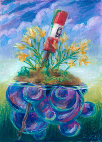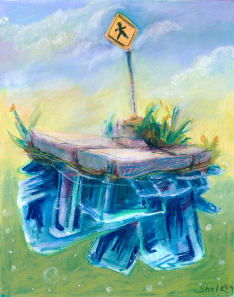 Neocolor II crayons on hot press watercolour paper. This is my first piece done entirely with the neocolors – putting down layers, washing them into the paper, and adding more on top, over and over. They’re very fun, but it does require some hand strength to press them hard enough to get the richest colour…