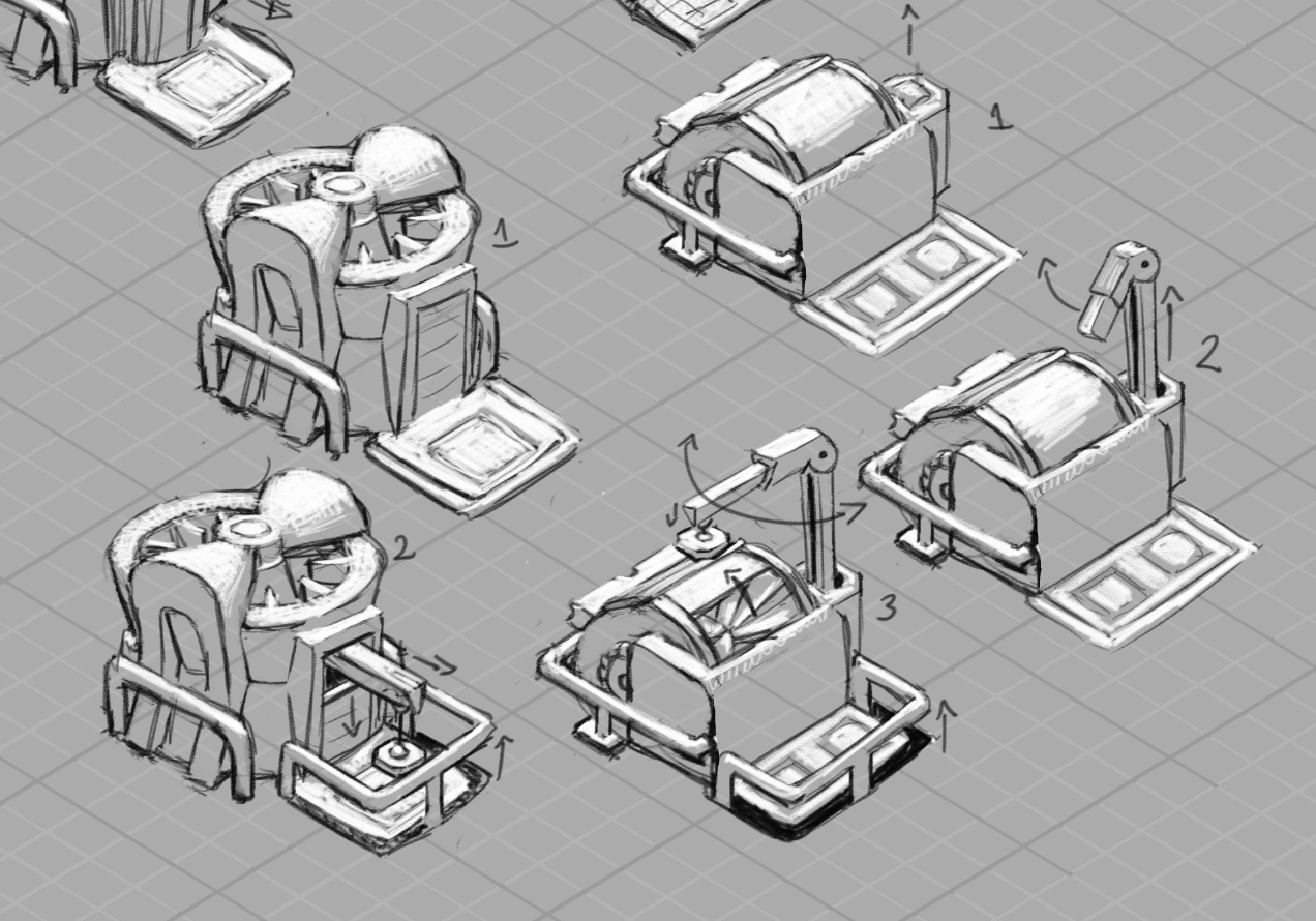 Firstup, we tackled some big ones: one of the things we wanted the player to get to work towards was processing raw materials — and that meant big processing equipment that could intake entire containers of raw material and spit out something different. These were a really fun challenge to keep in the same design language as our smaller machines while pushing the scale.