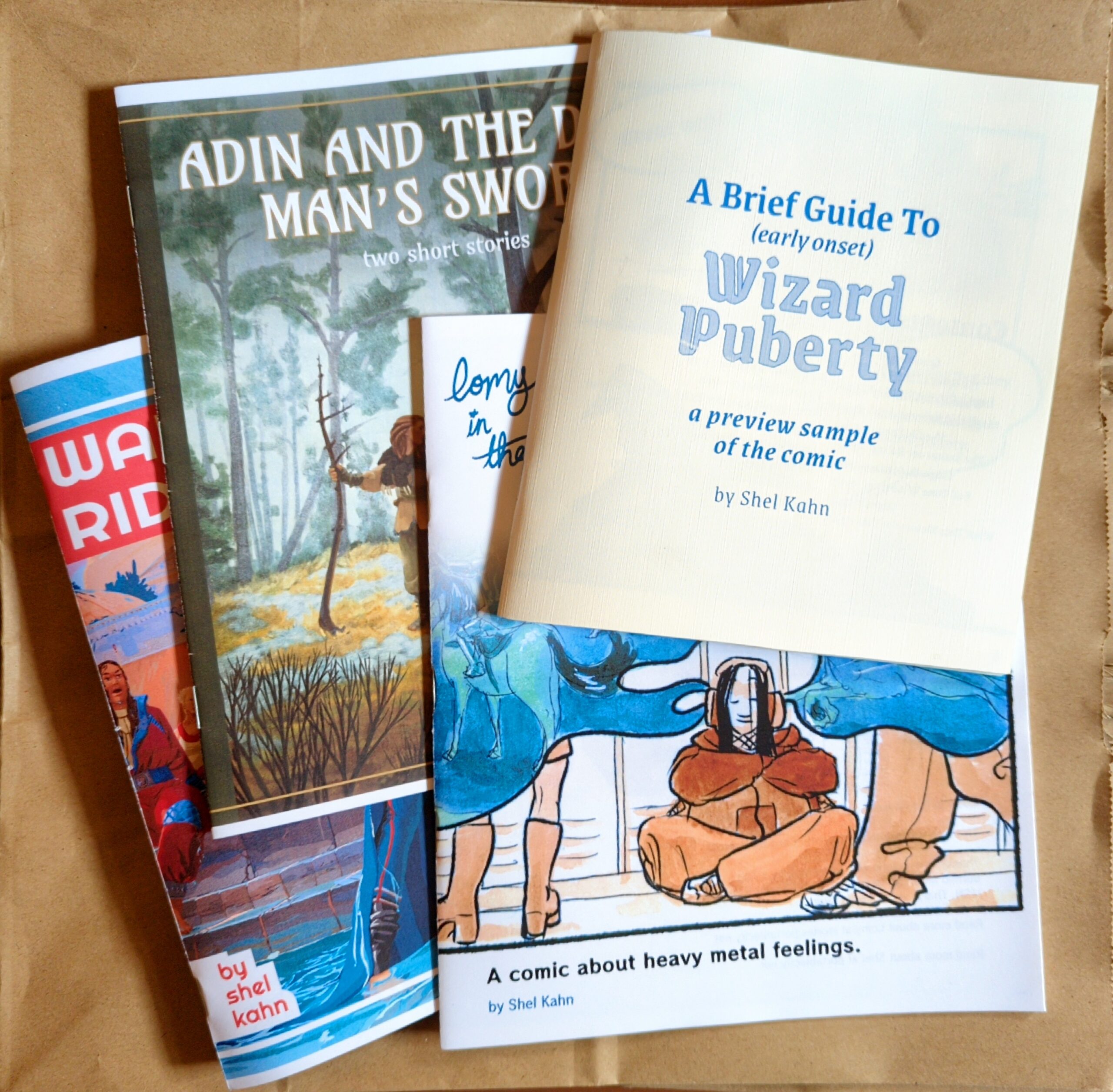 You’ll be able to finally get your hands on a collection of all the existing Lomy in the Abyss comics! I’ll have a zine of both of my short comics about Adin! I’ll have a few print copies of my goofy pulp scifi novella about time orbs! And I’ll have a preview of my wizard puberty zine, which I’ve been working on this spring and summer and can’t resist the urge to show off – though sadly it wasn’t possible to finish it in time to print for TCAF!