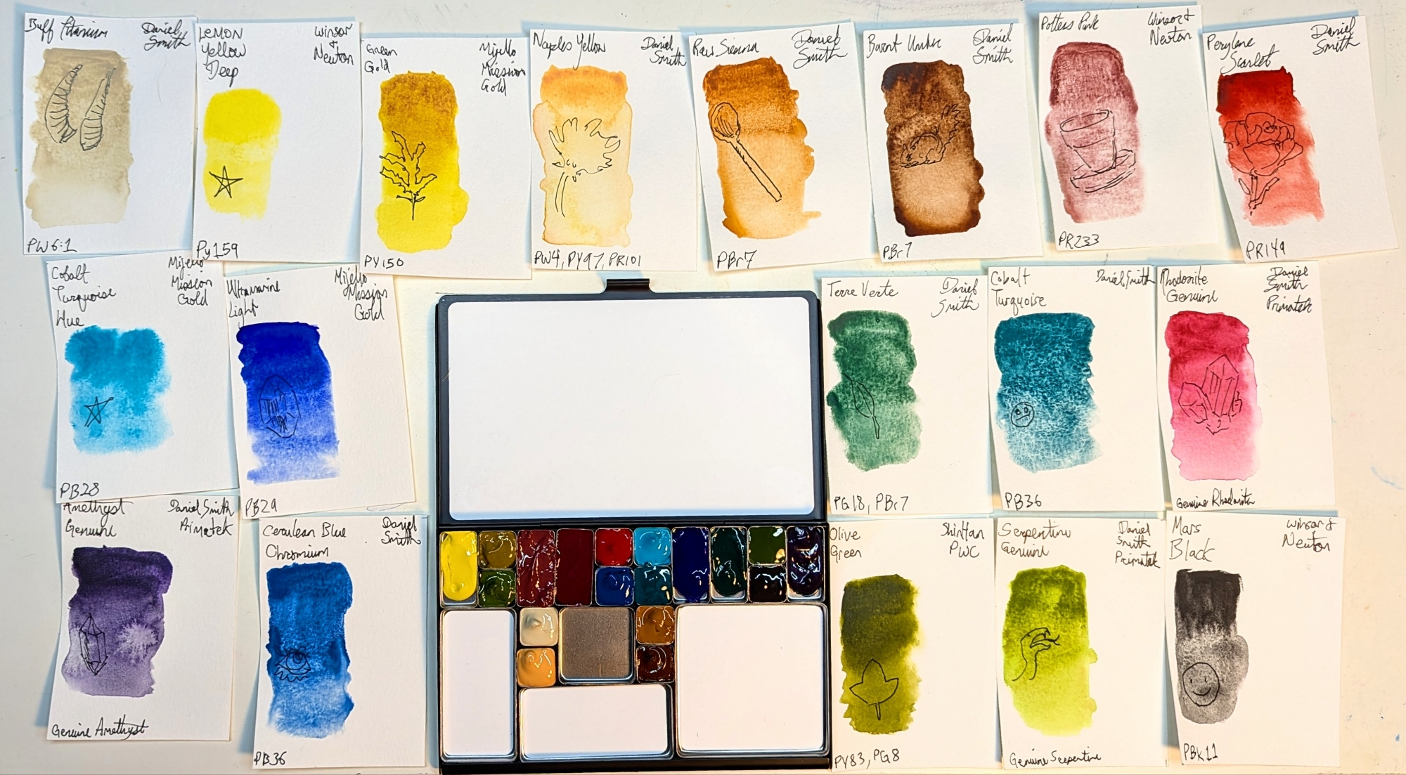 In good timing, I also finished swatching all my watercolours onto cards, so I used them to assemble myself a palette of tube paints to fill this with: