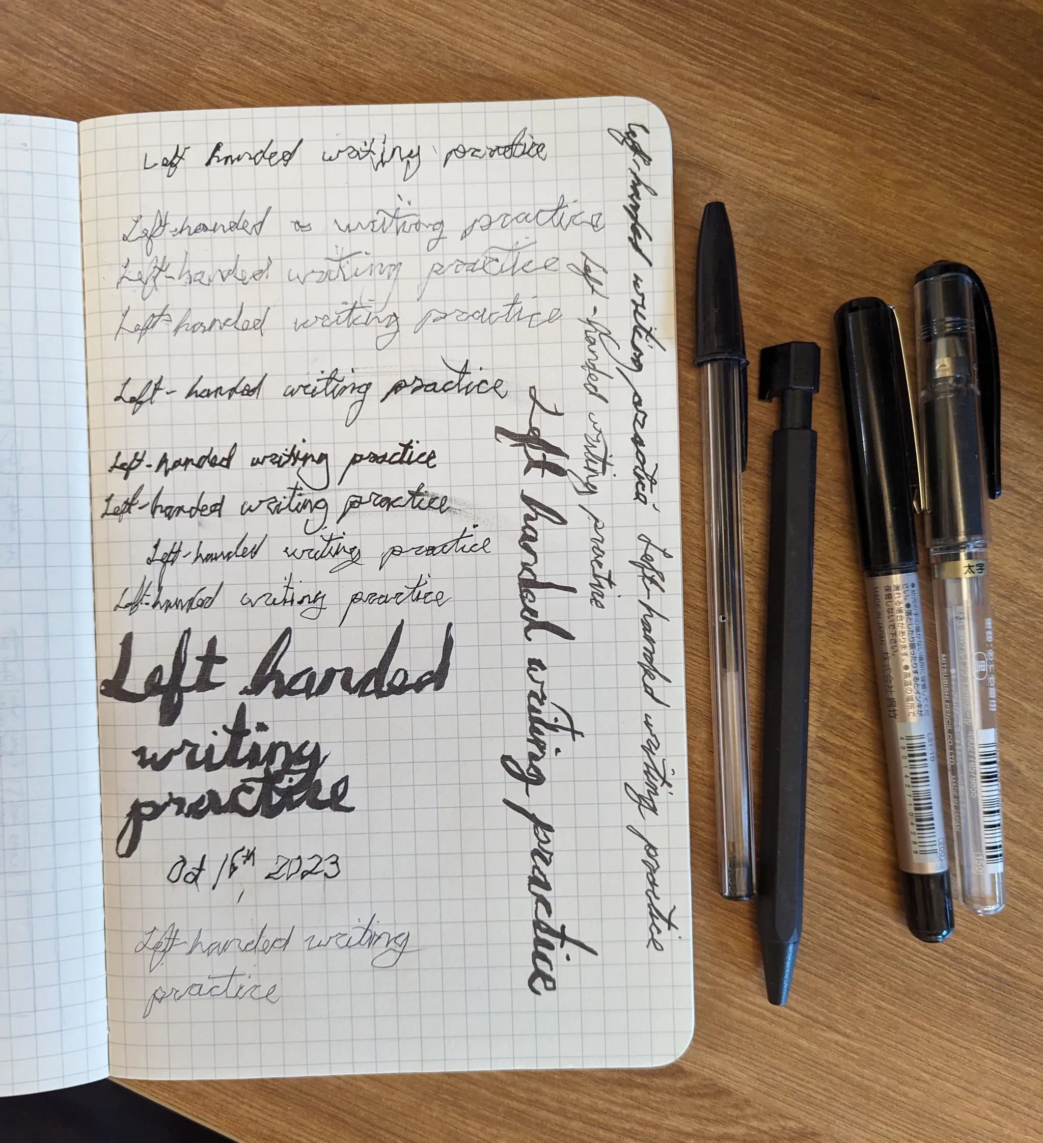There’s three distinct hand positions folks use to write left-handed – keeping your hand above the line, alongside the line, or below the line of text. Smearing your lines by rubbing your hand along them as you progress from left to right is a real frustration, and the above-the-line and below-the-line hand positions are both responses to that concern; but the internet was very certain that the above the line, curled-wrist hand position was a recipe for carpal tunnel, so given my experience with that I wanted to avoid it. This really only left me the below-the-line hand position for writing, and the problem with that was just how different it felt from writing right-handed.