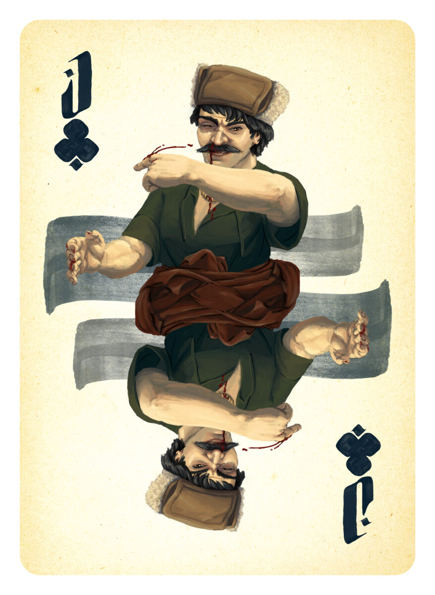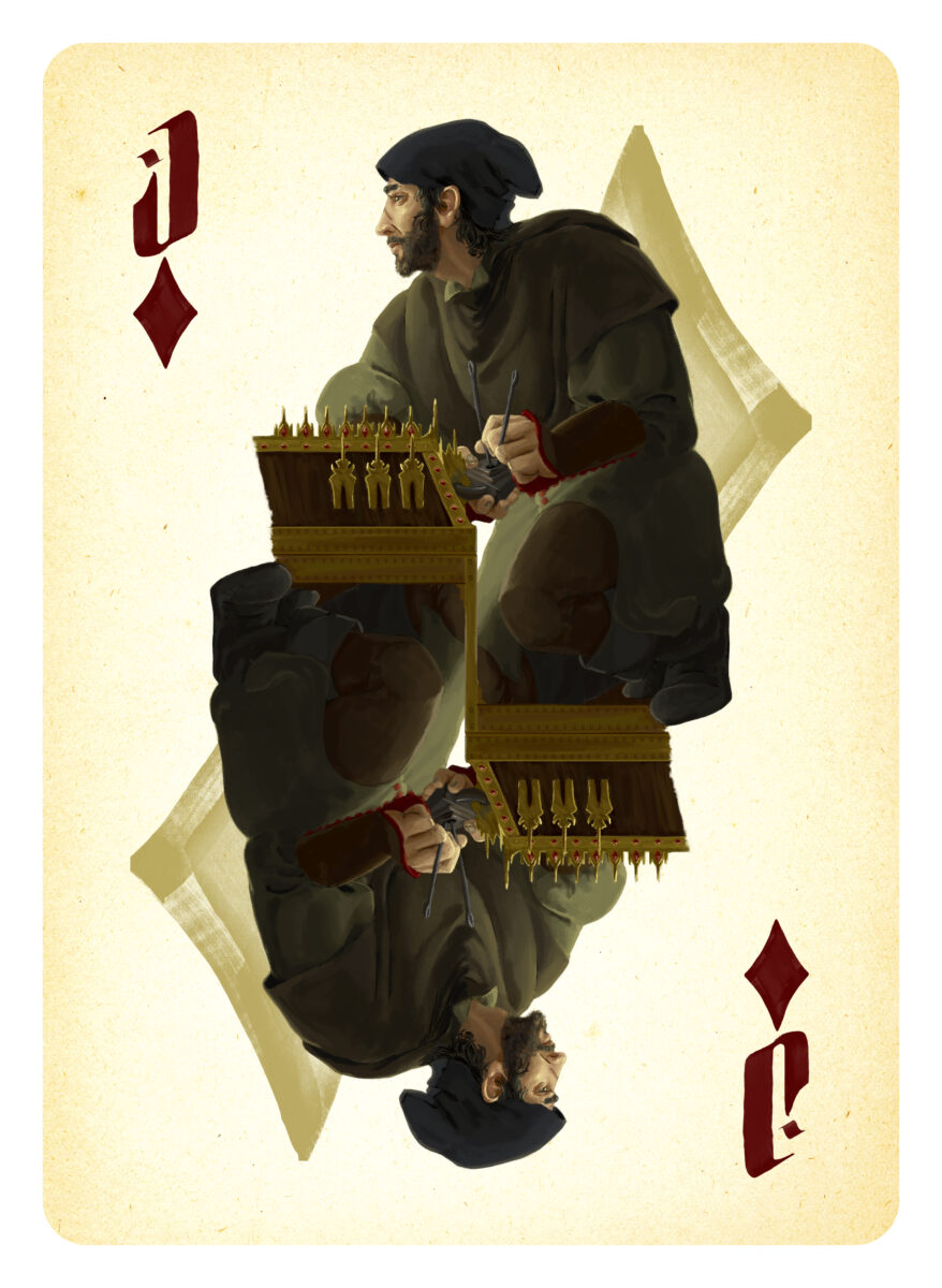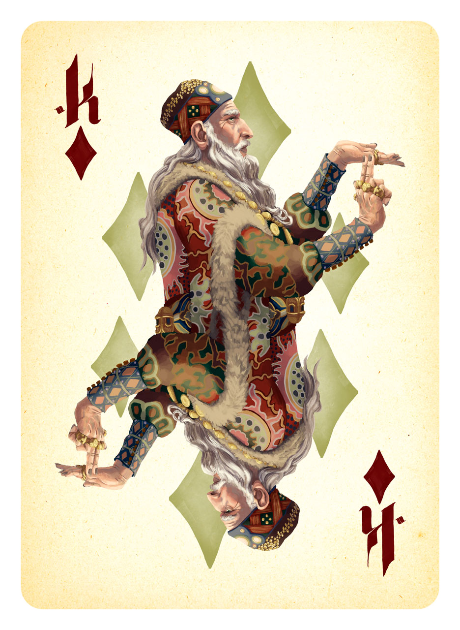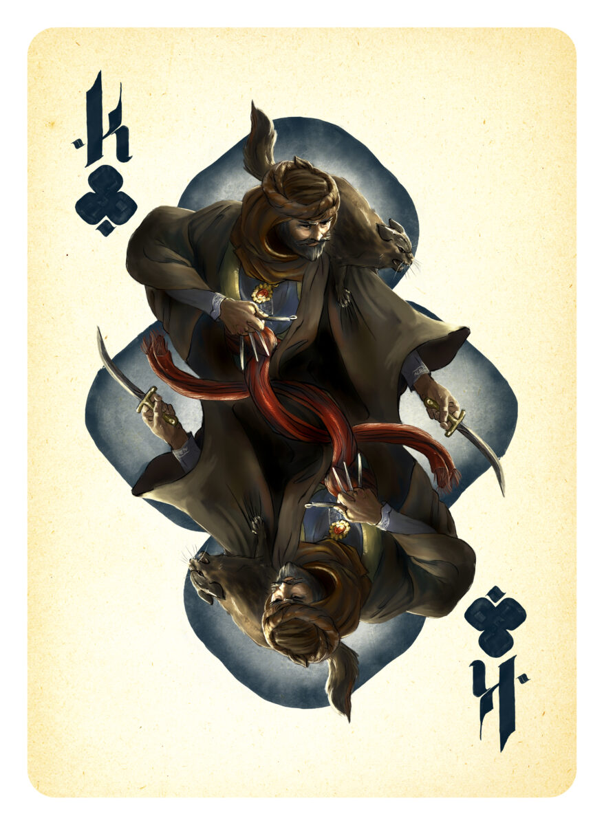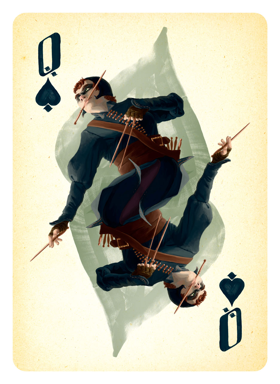 About a decade ago I had the privilege of painting a card deck of fantasy medieval fighters, thieves, assassins, and sorcerers for Will Hindmarch. He had pitched the card deck as both a play aid (the game he was developing at the time used a traditional poker deck) and a world building tool, filling the game with NPCs who taught the players about potential character encounters, NPC alliances, and the flavour and feel of the world they were playing in.