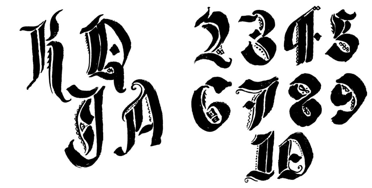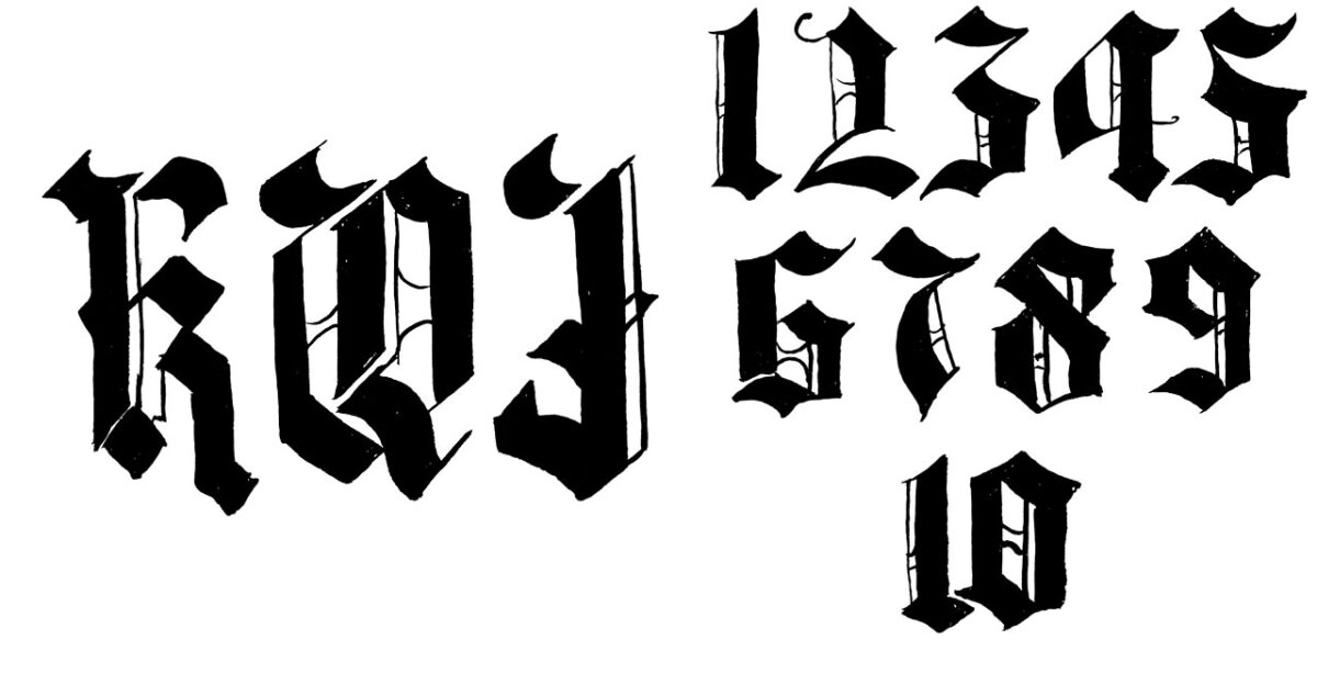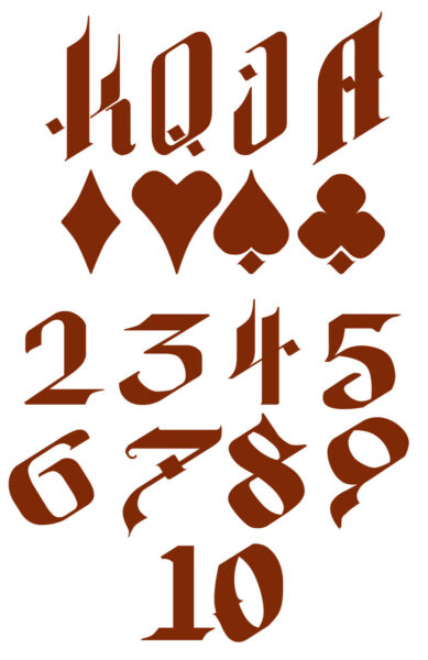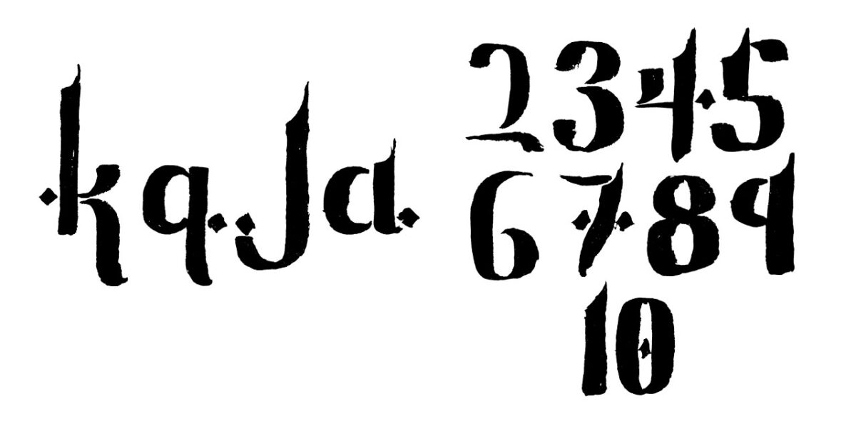 I also hand-lettered the cards, providing Will with all the numbers, letters, and icons required to build out the full deck. We built the lettering style by combining typographic influences from a variety of medieval manuscripts, and I painted them on paper to get as much texture as possible for the overlays on the backs of the cards, and then turned them into simpler vectors for use in the graphic design: