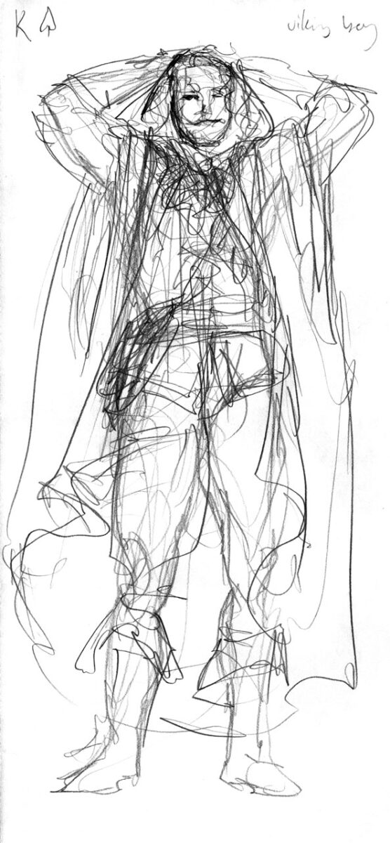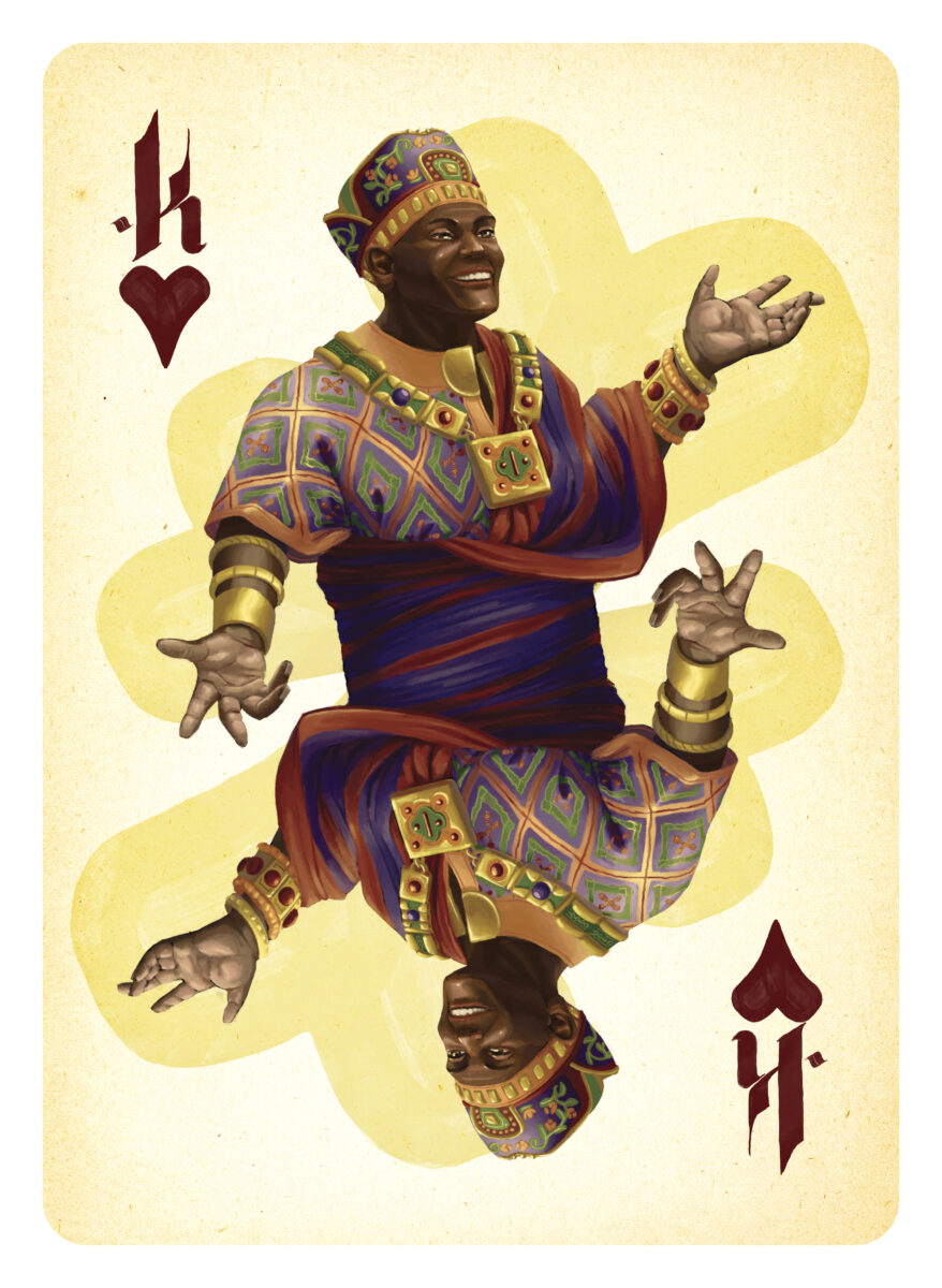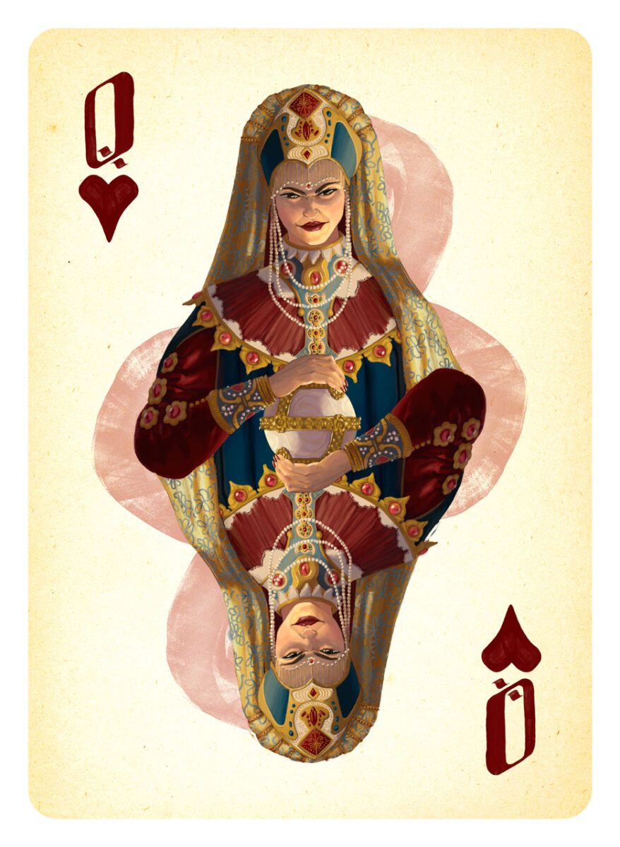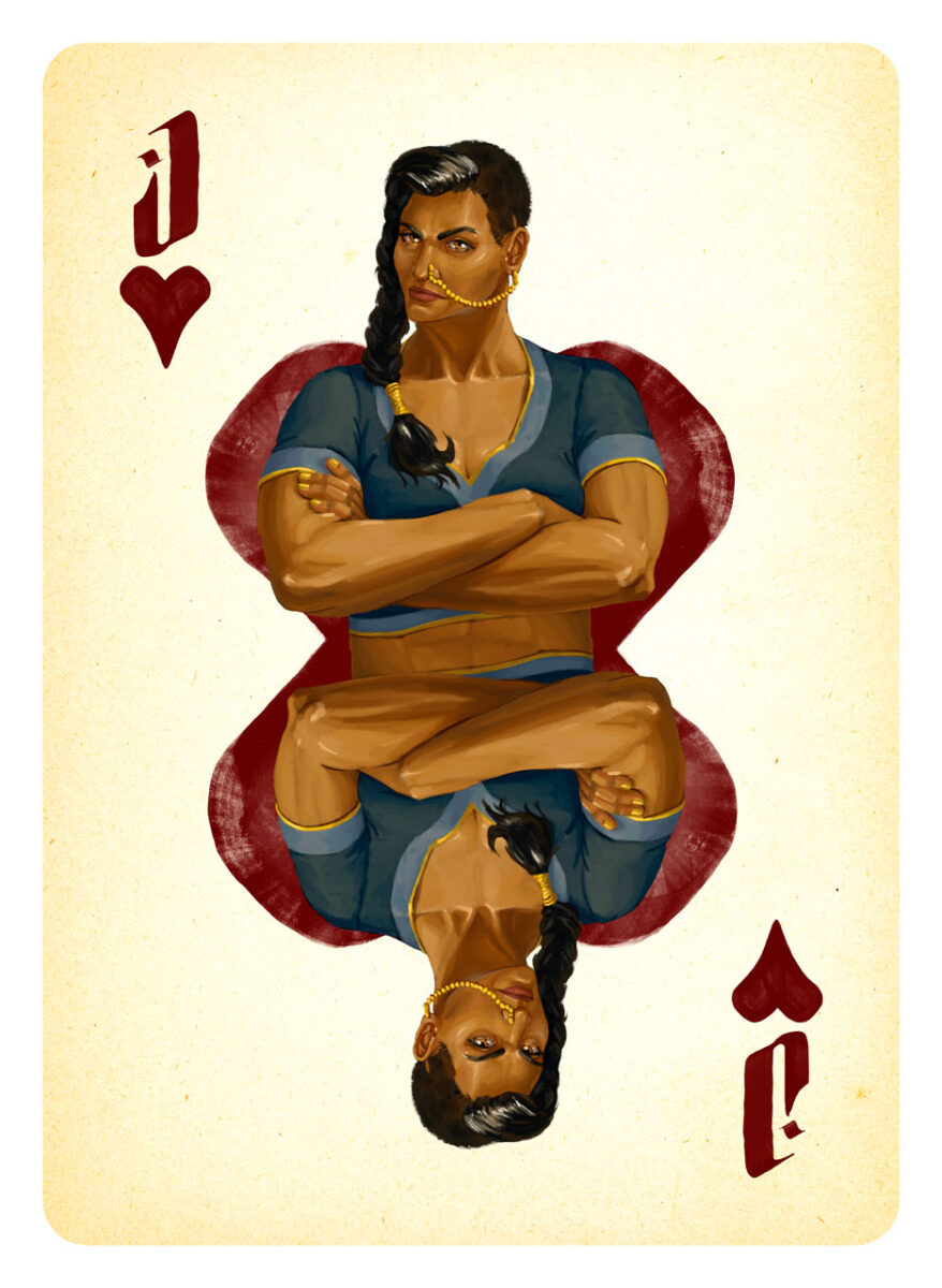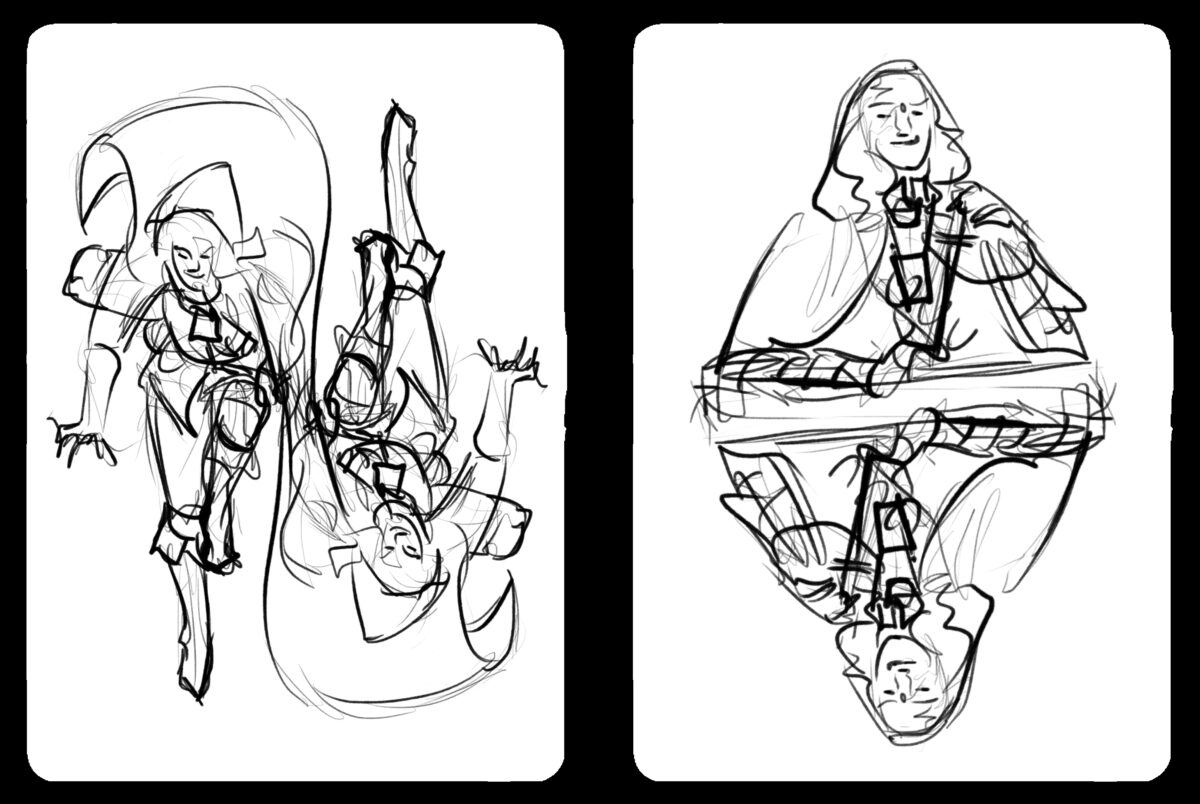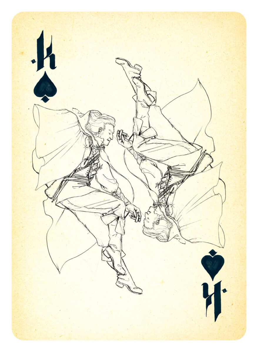 Before I set pen to tablet, I did a lot of drawing on paper, trying to nail down these characters as individuals, and to hammer out what poses best sold the character in the context of the playing card conceit, as we had the goal of keeping the surreal doubling of a bicycle-style poker deck’s face cards.